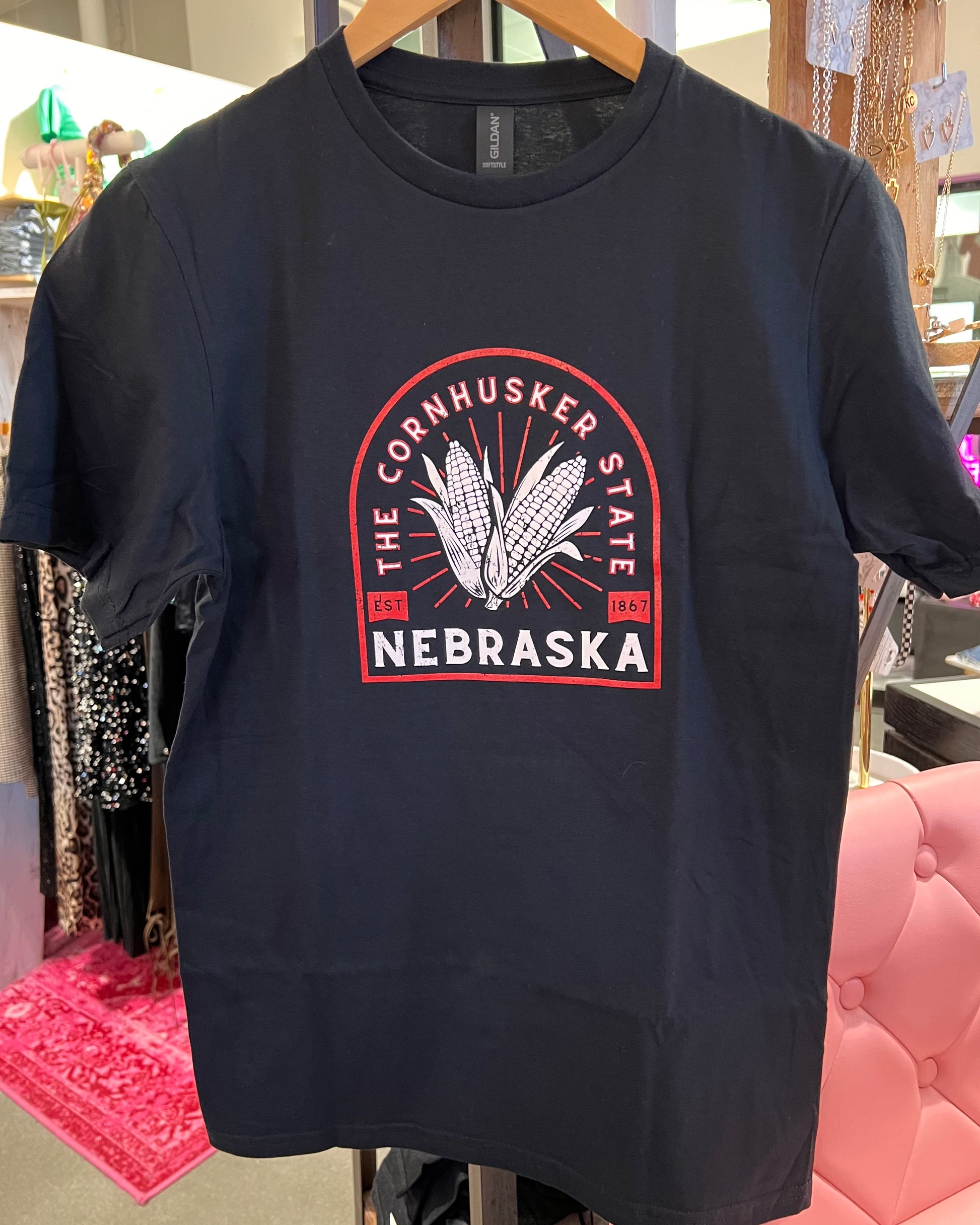 Black unisex tee with Cornhusker state design on front