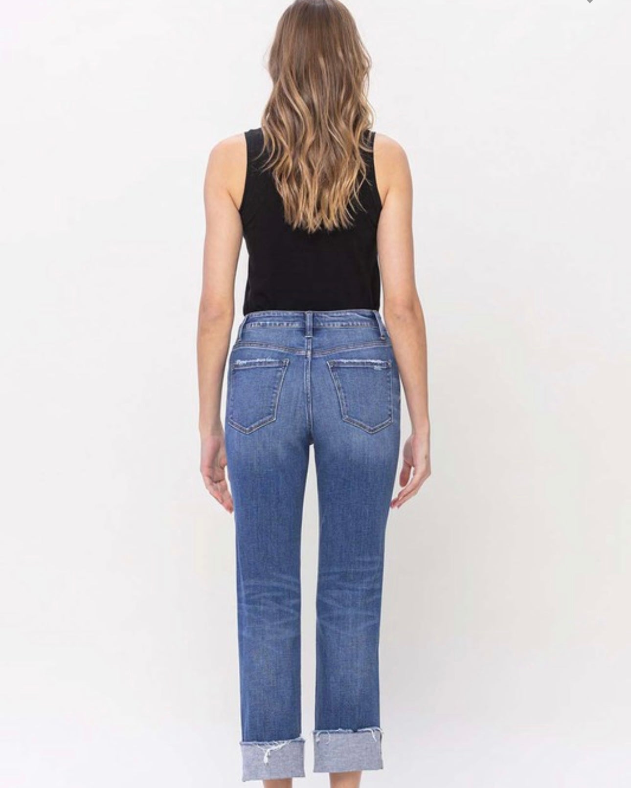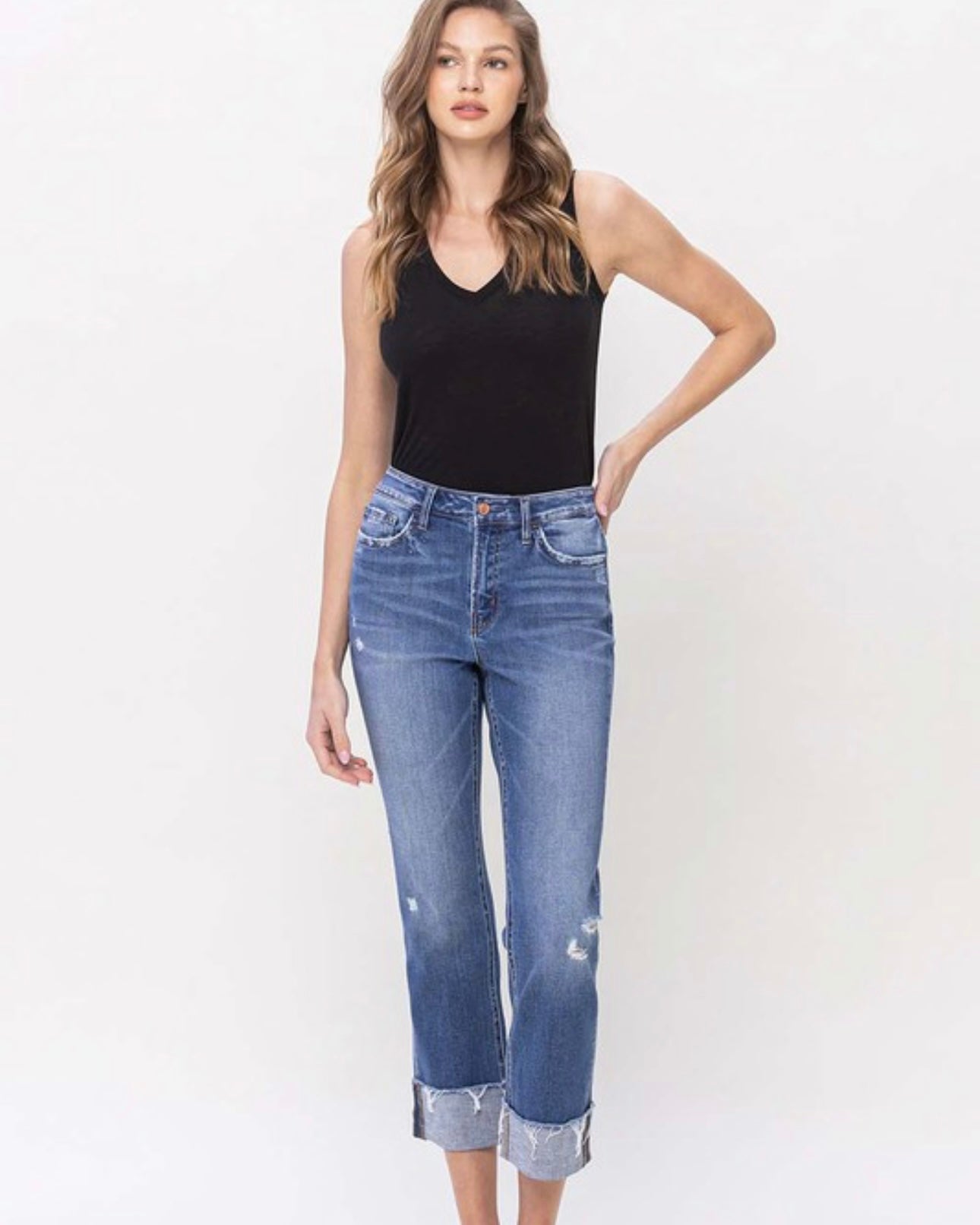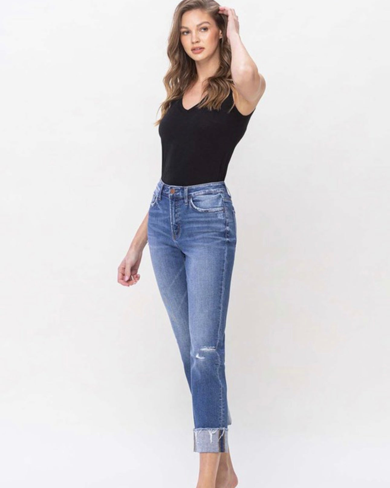 COMFORT STRETCH DENIM, HIGH RISE WAIST, DISTRESSED DETAIL, FRAYED ROLLED CUFF HEM, CROPPED LENGTH, STRAIGHT LEG JEANS
