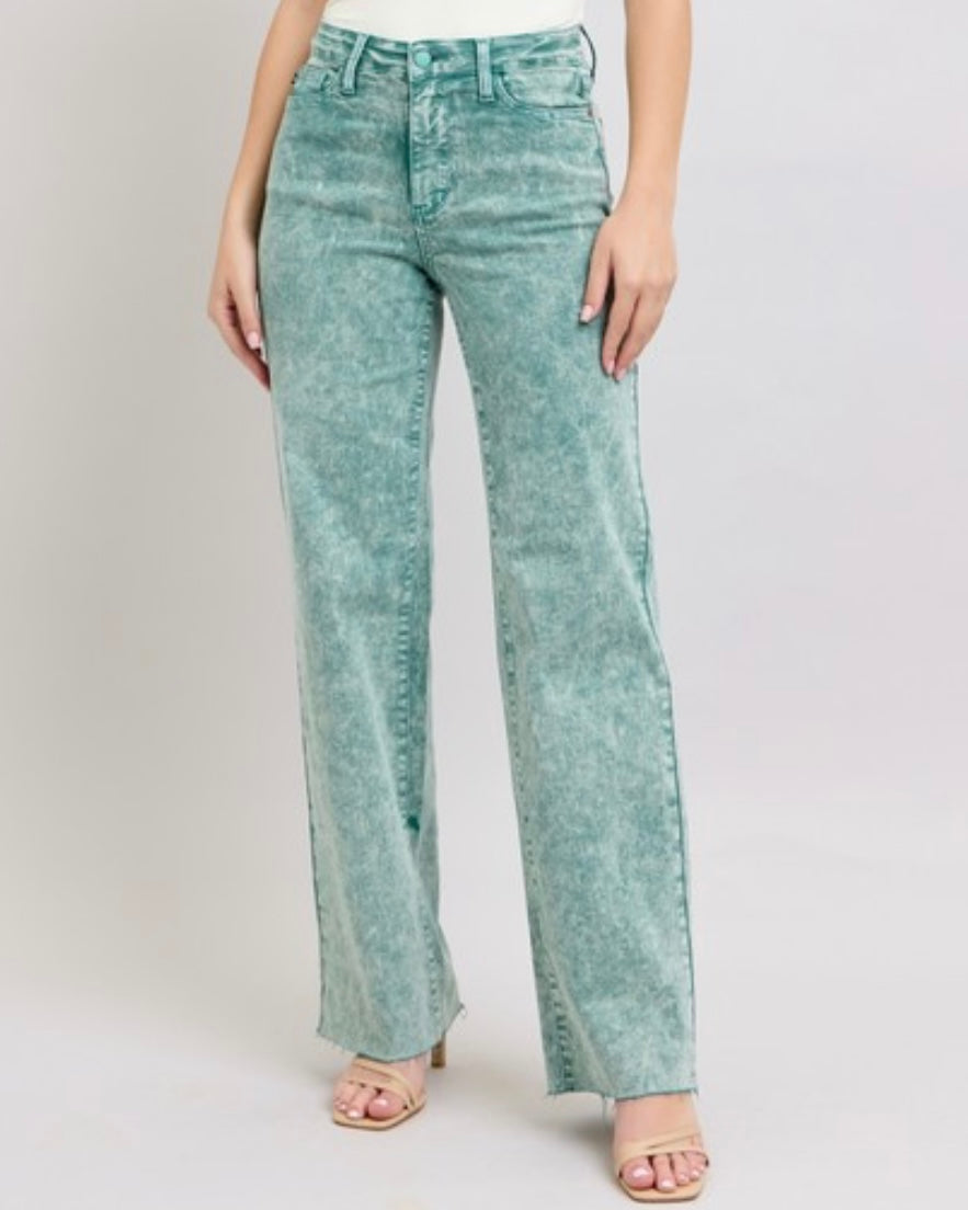 Seafoam green high waist raw edge dad jean, great Judy Blue fit
