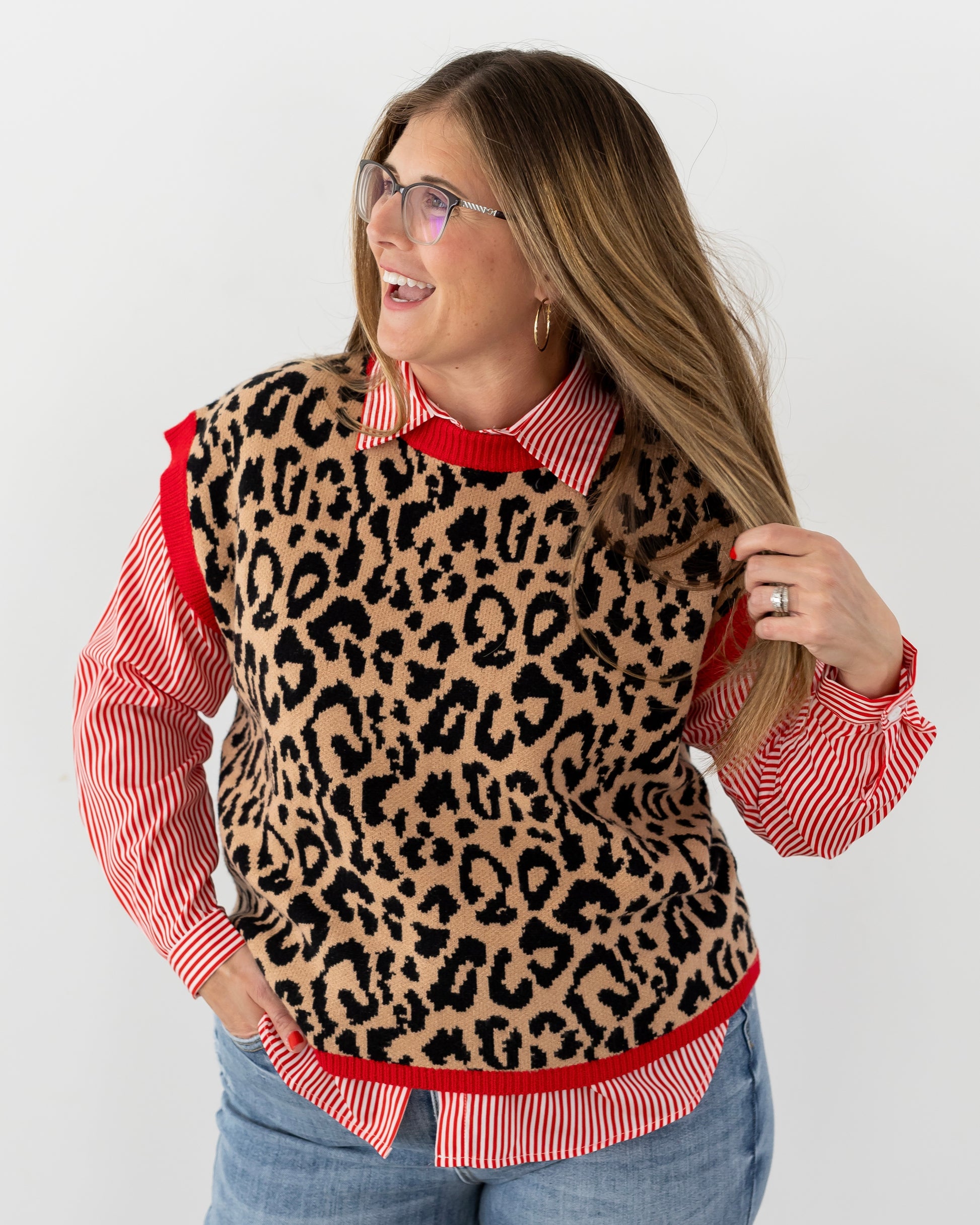 This leopard print sweater vest is a must-have for a bold and trendy look! Featuring a sleeveless design, soft knit fabric, and contrast ribbed trim, this versatile piece is perfect for layering over shirts, turtlenecks, or wearing on its own. Ideal for casual, streetwear, and chic outfit styles, this vest is a go-to for year-round fashion. Great for boutiques looking for statement knitwear!