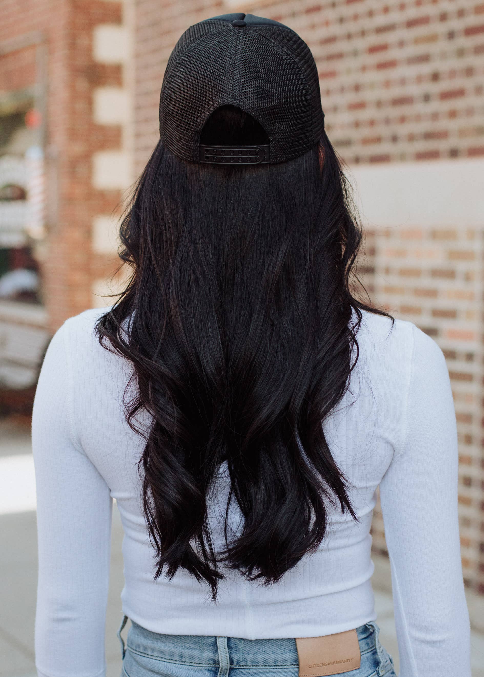 Black trucker hat Multicolored "Merry & Bright" embroidered on front Adjustable snapback closure Breathable mesh on the back