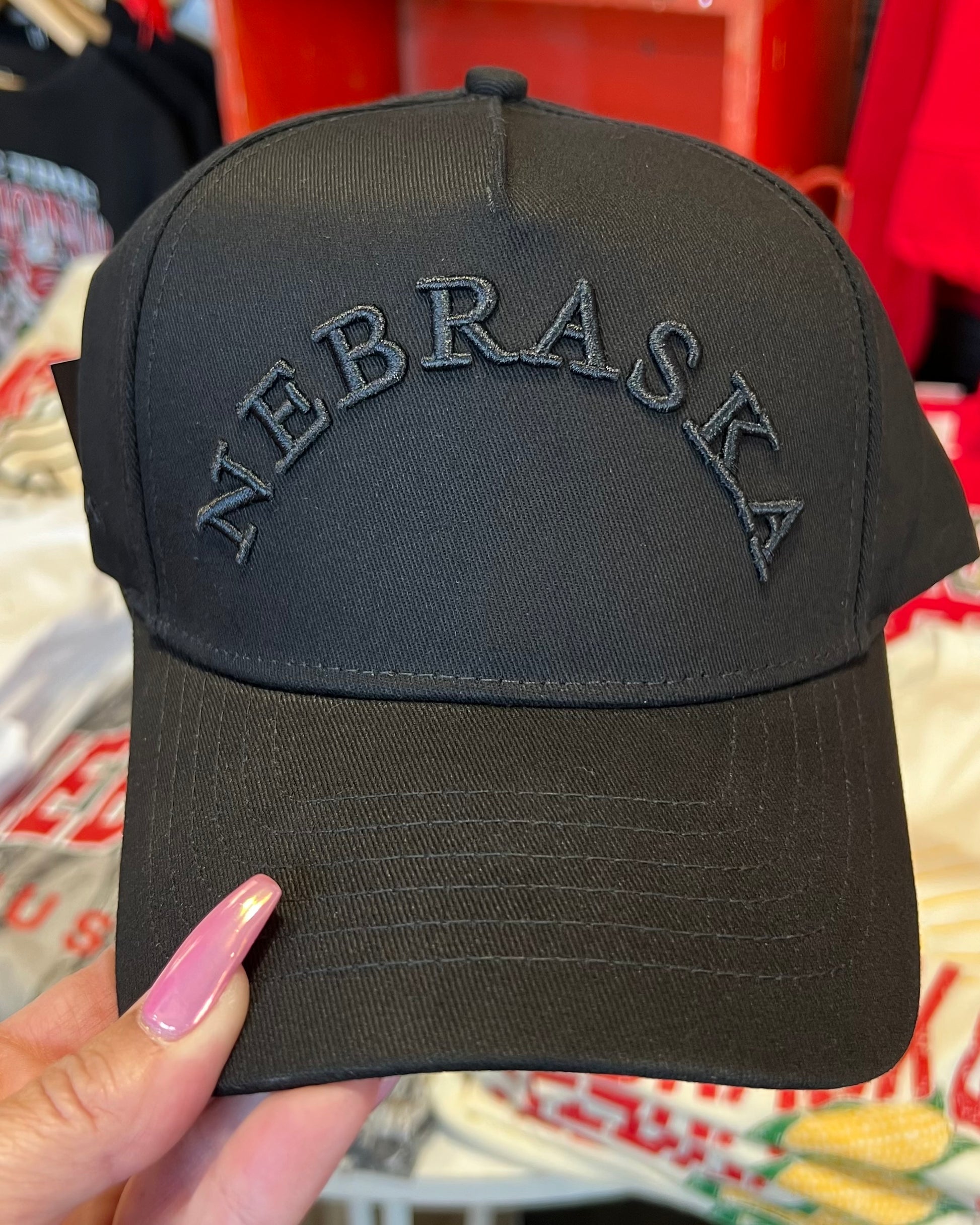 Adjustable black ball cap with black Nebraska embroidery. Perfect hat for blackout game.