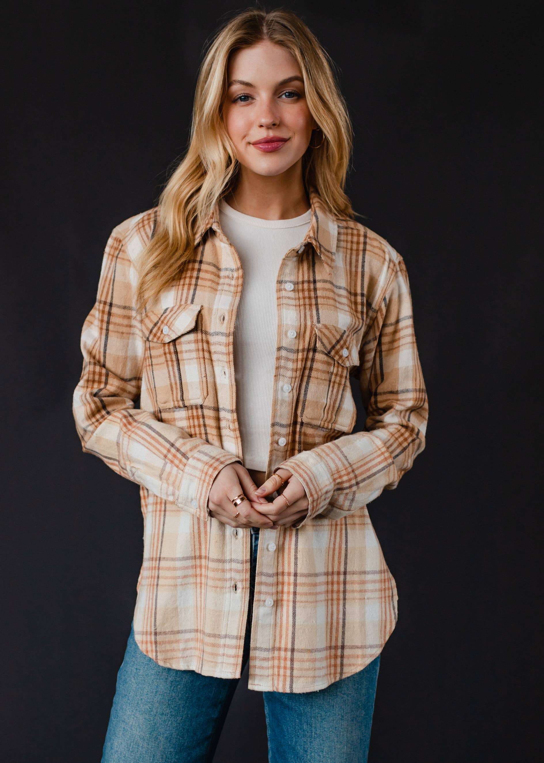 Tan, camel, brown & black plaid flannel with bleached dipped contrast 100% Cotton
